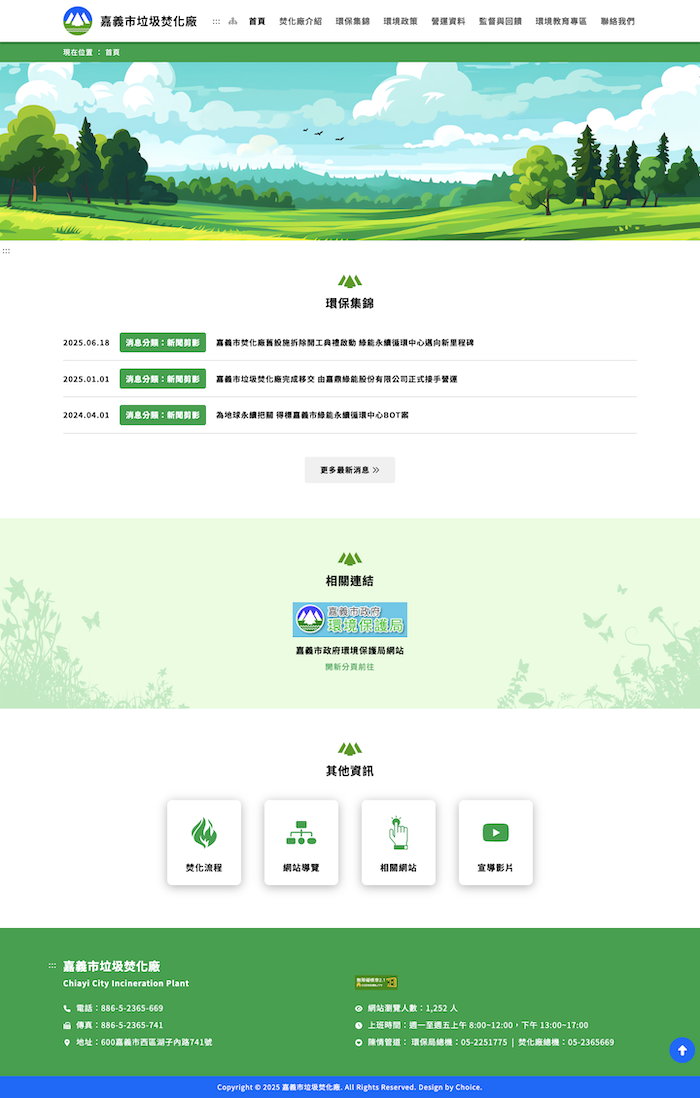 首頁 精選作品 網頁設計 嘉義市垃圾焚化廠 回作品瀏覽 嘉義市垃圾焚化廠 政府專案 無障礙網站 前往網站 Like Dislike 嘉義市垃圾焚化廠位於嘉義市湖內里、緊鄰八掌溪,每日設計處理容量300公噸,雖是國內大型焚化廠中處理容量最小的廠,但憑藉良好的營運管理及創新改善,其焚化設備運轉率全國最高。 回作品瀏覽
